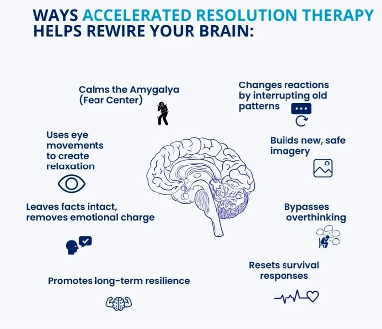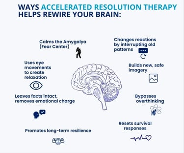 Accelerated Resolution Therapy (ART) is an evidence-based approach that uses guided eye movements and voluntary imagery replacement to help the brain process distressing experiences safely and efficiently. ART reduces the emotional impact of trauma, anxiety, depression, and other concerns—often without requiring clients to relive or verbally recount painful memories. Unlike other therapies, ART work more quickly in about 1-6 sessions on average to achieve significant symptom relief.