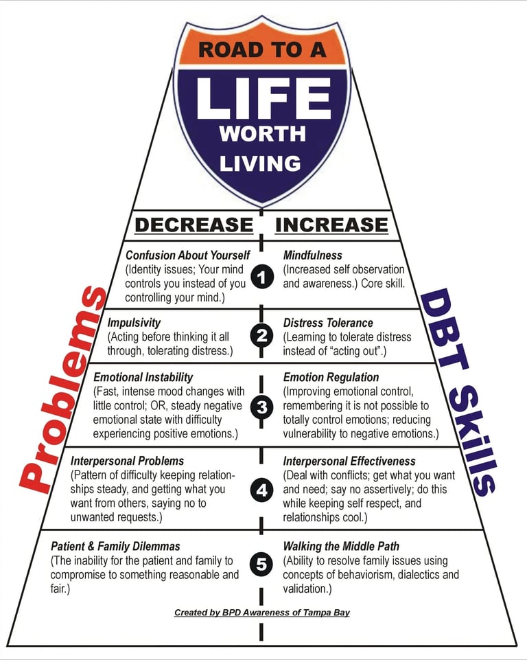 Dialectical Behavior Therapy (DBT) is an evidence-based therapy that helps you build skills to manage intense emotions, cope with distress, and improve relationships. DBT combines practical strategies with mindfulness and acceptance to support emotional balance, resilience, and meaningful change.